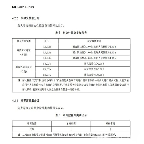 而今年4月29日發(fā)布的國家標(biāo)準(zhǔn)《防火卷簾 第1部分:通用技術(shù)條件》(GB14102.1-2024)則正式刪除了防火卷簾產(chǎn)品分類中側(cè)向卷和水平卷類別,這意味著防火卷簾的啟閉只有垂直卷這一個類別;同時,該標(biāo)準(zhǔn)還規(guī)定防火卷簾主要按照耐火性能和簾面數(shù)量進(jìn)行分類,耐火性能分類由9類簡化為2類6級(隔熱防火卷簾和非隔熱防火卷簾),簾面數(shù)量分為單幅簾面和雙幅簾面,具體如下: