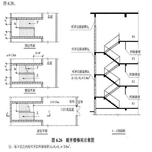 6. 《建規(guī)指南》641條P319:疏散樓梯間應(yīng)具有較高防火、防煙性能…如下圖示敞開樓梯間設(shè)擋煙垂壁。