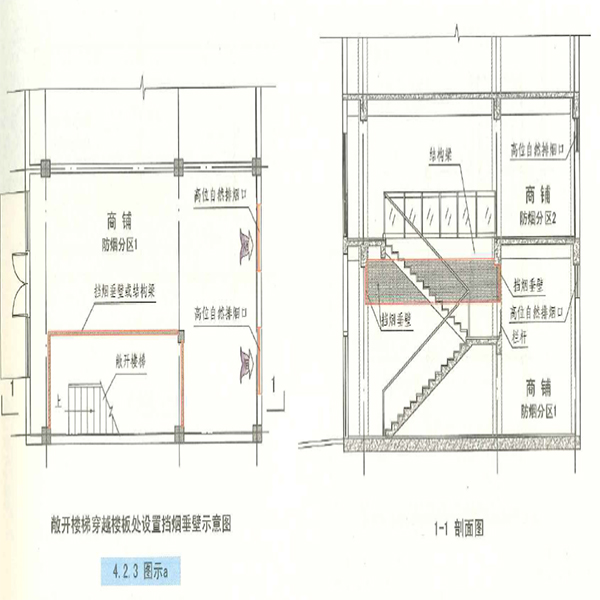 5. 《煙標(biāo)》423條:設(shè)置排煙設(shè)施的建筑內(nèi),敞開樓梯和自動(dòng)扶梯穿越樓板的開口部應(yīng)設(shè)置擋煙垂壁等設(shè)施。(個(gè)人注:主要指開口部位,上下同一防火分區(qū)也要設(shè)擋煙垂壁。)《煙標(biāo)圖示》: