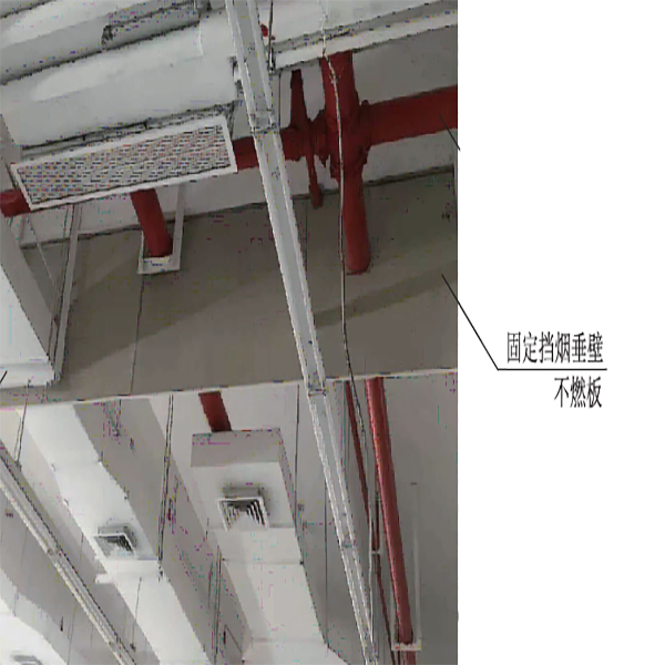 3. 《擋煙垂壁》512條:材料:5~不燃材料+金屬板材≮0.8mm熔點(diǎn)≮700+不燃無機(jī)復(fù)合板≮10mm+無機(jī)纖維織物拉力600N300N+防火玻璃。