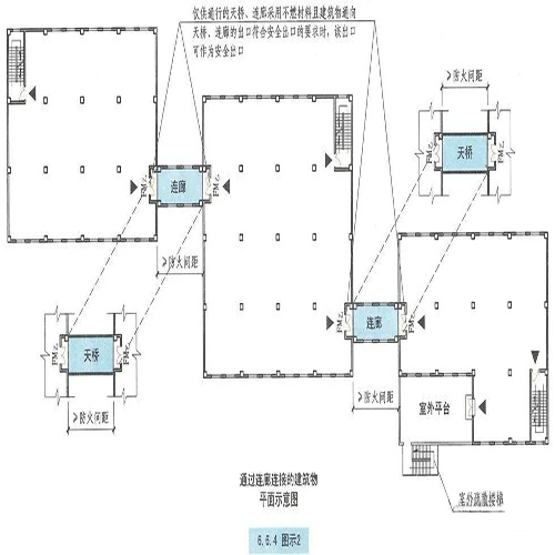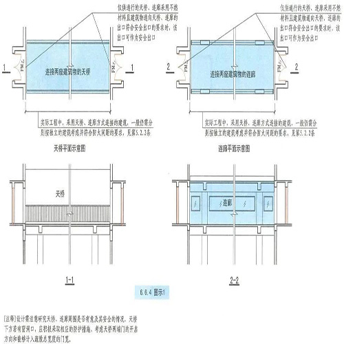 很多項(xiàng)目為方便使用,會(huì)采用天橋、連廊將幾座建筑物連接起來。這種連接方式雖方便了相鄰建筑間的聯(lián)系和交通,但也可能成為火災(zāi)蔓延的通道,因此現(xiàn)行規(guī)范規(guī)定需要采取必要的防火措施,以防止火災(zāi)蔓延和保證用于疏散時(shí)的安全,如下: